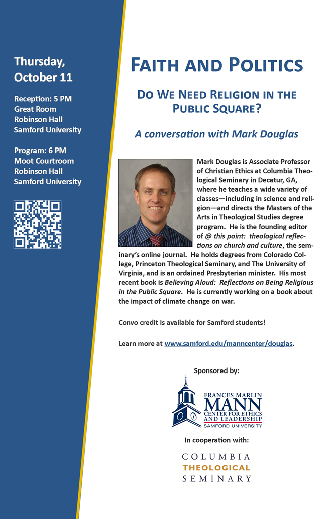 The Frances Marlin Mann Center for Ethics and Leadership is pleased to invite you to an evening with Christian ethicist and author Mark Douglas on Thursday, October 11th, in Robinson Hall. The program will begin at 6 p.m., following a 5 p.m. reception. See below for details, or visit our website<http://www.samford.edu/manncenter/douglas> - I hope to see you there!